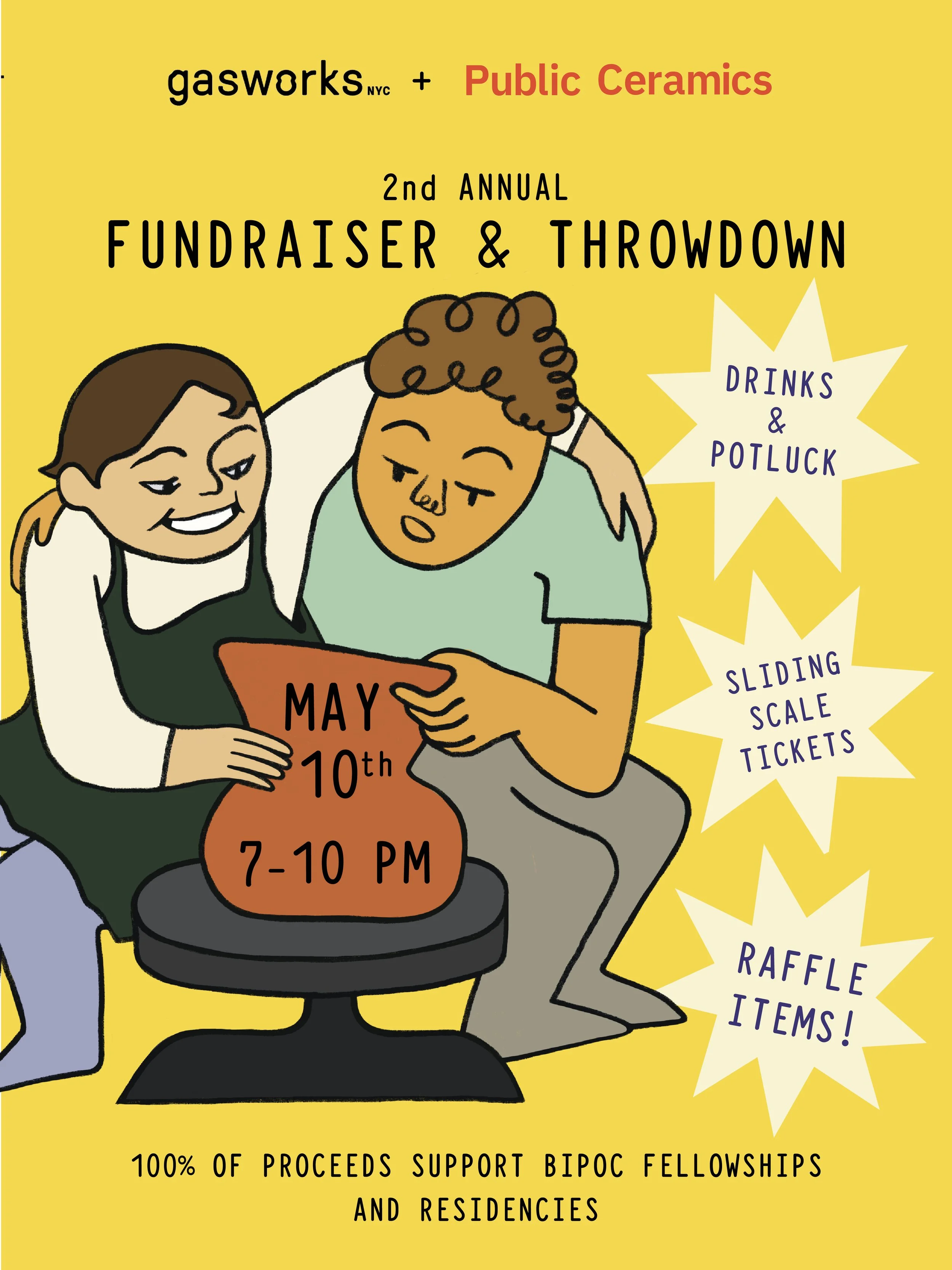 Please join us for an evening of festivities celebrating Public Ceramics! Sliding scale tickets, with 100% of proceeds supporting Public Ceramics, will get you two drink tickets and 2 raffle tickets. Raffle prizes include ceramic tools, gift certificates, and other goodies from members of our community. The Throwdown begins promptly at 7:30, and participants in the competitions have the opportunity to win hand-made plaques by Sara Shaw. To participate in the throwdown, please forward your ticket confirmation to hello@gasworksnyc.com and we will send you the sign up sheet.